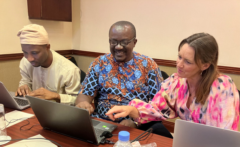 Dr Adegboyega Taofeek Tope, professor Ezera Agwu och Dr Sofia Birgersson utarbetar en budget för projektet. Fotograf Teresa Soop, Sida.